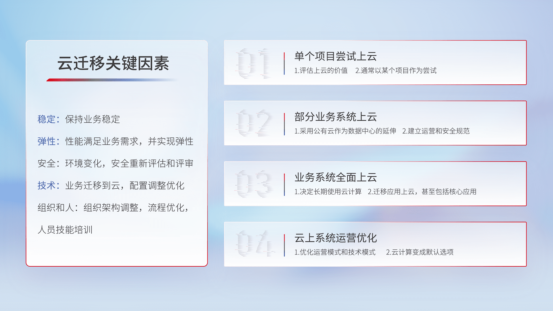 结合实际业务,,,从规划设计、、、、云平台选型、、云原生改造、、、数据迁移、、、、集成交付,,,迁移全过程为客户识别最佳上云路径,,做好风险识别管理,,设计网络架构、、、、身份权限、、、安全审计合规、、操作审计、、日志审计、、、监控告警策略、、、、多站点容灾设计等,,,对云上基础设施进行整体规划,,提升IT治理水平,,,以满足弹性、、、高可用、、、高性能的需求。。。。